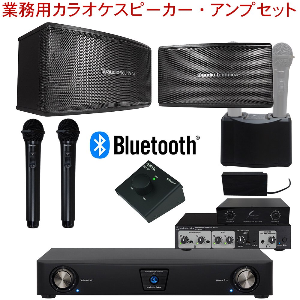 【送料無料】audio-technica 業務用カラオケスピーカーセット (Bluetooth受信機/ワイヤレスマイク2本/マイクエコーミキサーセット)